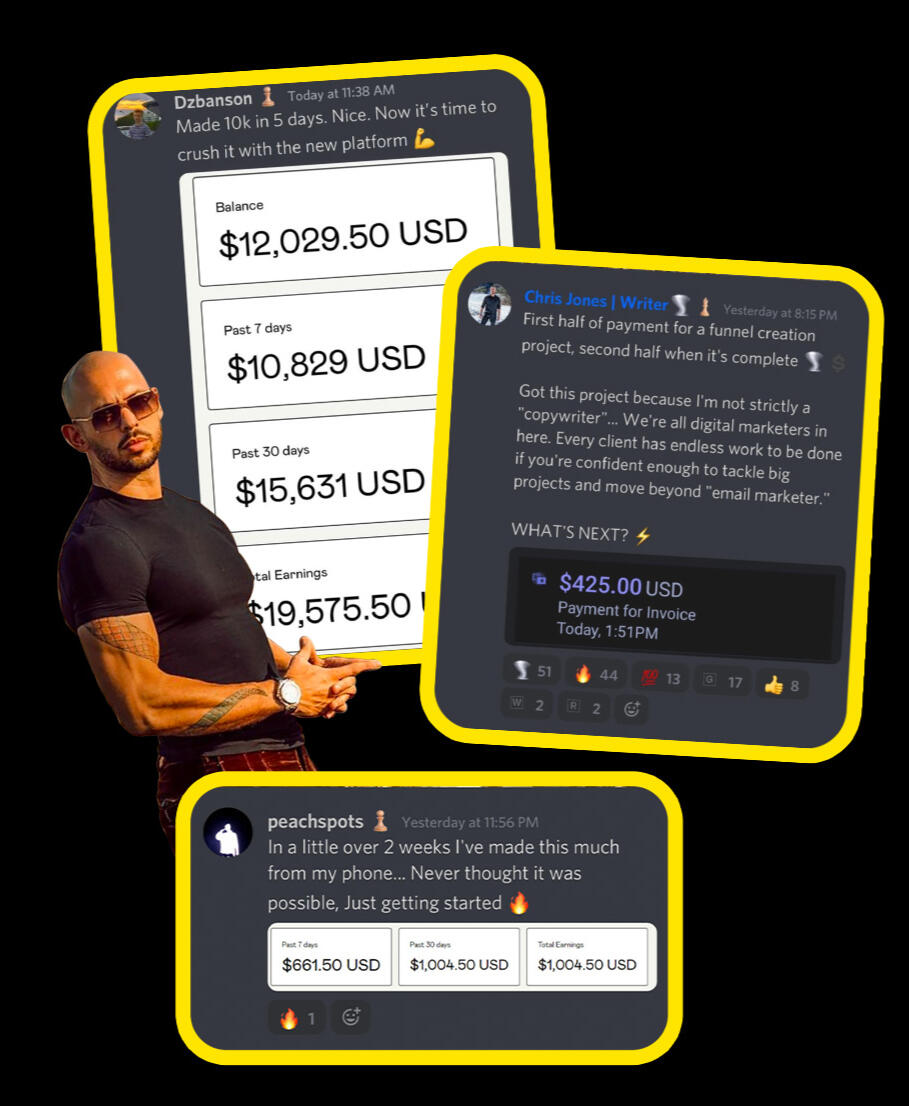 How does it work?Hustler’s university runs completely inside Discord. You will have access to a huge community of like-minded individuals and have direct contact with a qualified team of professors. All the needed lessons are found inside Discord.How do I sign up?Clicking one of the sign-up buttons on this page will send you to the payment page. After the payment is confirmed, you’ll get invited to the Discord server.Who owns Hustler’s University?Hustler’s University is owned by Andrew Tate.Do I need any third-party software?Yes, you will need Discord and a Discord profile (it’s free), and depending on which money-making method you want to pursue, you might need additional software (most have free options)What is expected from me?Be hardworking, respectful, coachable, and listen to the professors. If you are all of the above, you are guaranteed to make money.What if it isn’t for me?No hard feelings, someone needs to flip the burgers. You can cancel your membership at any time and you will no longer be charged for any additional months. You will continue to have access until your membership expires.